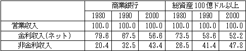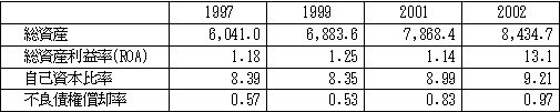 もっとも、大手米銀においては、厚い自己資本に加え、デフォルトリスクのみを取引するデフォルトスワップなどのクレジットデリバティブの手法の活用等により貸出債権のリスクヘッジが進んでおり、景気動向等により貸出先の財務内容が急激に悪化しても必ずしも不良債権が急増しない体質を構築していると言われている。通貨監督庁(OCC)は1997年からクレジットデリバティブの数字の報告を求めているが、97年には契約残高547億ドルだったのが2002年末には6,348億ドルとその利用が急増している。 |