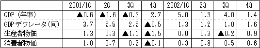 米国においても、物価の上昇率が低下してきており、これがデフレとなって米国経済に深刻な影響を及ぼす可能性が懸念されるようになってきている。実際、2002年にはGDPデフレータの上昇率が1.1%と、1961年以来の低い数字となっている。