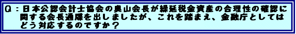 | A | : 公認会計士協会の奥山会長からの通達の件でありますけれども、これは公認会計士協会のいわゆる実務指針の中で、自らがお作りになった実務指針の中で繰り延べ税金資産をどう評価するかということに関して、非常に厳密なルールを作っているわけです。そのルールを厳格に適用して、公認会計士、監査法人としての社会的責任を果たしていくというような趣旨であったと思いますので、これは我々としてもぜひ非常に歓迎したいと、このようなご努力を多としたいというふうに思います。 それで、繰延税金資産ですけれども、これは正に検査の中で、これは資産査定、資本評価の中の非常に重要な部分になってまいりますので、もちろんこれは検査の中でこれまでもやってきたわけですけれども、市場の声にも耳を傾けながら、特にその点に注意しながら検査をやっていくということで、これはもう検査の中でそういうことを着々とやっていっているというふうにご理解をいただければよいと思います。 |