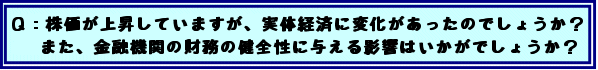 :例えば、株価のボトムであった4月における実体的な判断と、今における実体的な判断に非常に大きな差があるというふうには思っておりません。我々の実体経済に対する判断は、月例経済報告を見ていただければ、我々としては非常に客観的にその時点での評価をしているつもりであります。もちろん、全く同じであるということでもありません。特に企業の収益とか、それを反映した期待、それに大きな変化があるからこそ実際の株価は動いているのだと思います。 我々としては、いずれにしても実体経済をしっかりと見つめて、それを良くしていくこと。そうした中で構造改革の姿を明確に描くことによって、将来に対する期待を更に高いものに持ってもらうこと、これが政策当局の役割だと思います。 |