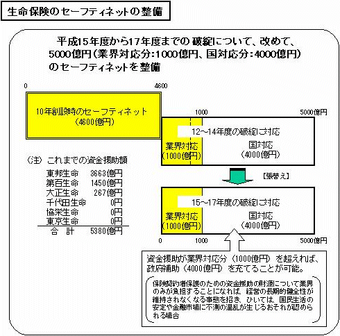 | 1 | .生命保険のセーフティネットの整備 先ほど述べたとおり、生命保険のセーフティネットについて平成12年に設けられた政府補助の特例措置は、平成15年3月末までの破綻に対応したものとされていました。今回、現下の生命保険を取り巻く環境に鑑み、保険契約者等の保護を図り、生命保険に対する信用を確保するため、平成12年に整備されたセーフティネットと同様、業界対応分1,000億円、国対応分4,000億円の、合計5,000億円規模のセーフティネットを改めて整備しました。 具体的には、平成15年度から平成17年度までの生命保険会社の破綻について、資金援助の費用を保険会社のみが負担することになればその財務の状況を著しく悪化させ、保険業に対する信頼の維持が困難となり、ひいては国民生活の安定や金融市場に不測の混乱を生じさせるおそれがあると認められる場合に、政府は予算で定める金額の範囲内で補助を行うことができることとしています。 |
