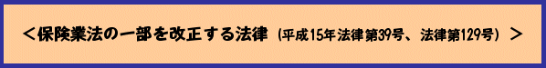 改正法をご覧になりたい方は、金融庁ホームページの「国会提出法案」から「第156回国会における金融庁関連法案」に入り、「保険業法の一部を改正する法律(平成15年3月14日提出、平成15年5月9日公布、平成15年6月8日施行)」、「保険業法の一部を改正する法律(平成15年5月23日提出、平成15年7月25日公布)」にアクセスしてください。 |