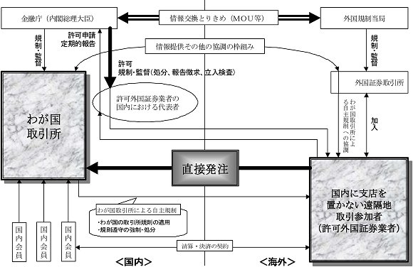 .外国証券業者に関する法律の一部改正 我が国の証券取引所が国際的な市場間競争に適切に対応し、積極的な海外展開を行うことが必要とされる中で、我が国の証券取引所が、海外の取引所が行っているのと同様に、海外の証券業者に端末を設置し、その上場商品を国外から直接発注させる業務展開を図ることを可能とする必要があります。 そこで、今般の法改正において、取引所取引における外国証券業者の支店設置義務を見直し、不公正取引の防止に配意しつつ、外国証券業者が、国内に支店を設置することなく、我が国の取引所市場の取引参加者となって直接発注することを可能とする制度を整備することとしました(図2参照)。 具体的には、このような外国証券業者による我が国取引所市場への直接参加を許可制の下で認めることとし、許可を受けた外国証券業者について所要の監督制度を整備し、当局による報告徴求や立入検査等の権限を定めました。 さらに、当局や我が国証券取引所の自主規制による監督・監視の実効性を確保する観点から、当該外国証券業者について、国内に代表者を置くことを義務付け、また、許可に当たっては、(1)当該外国証券業者を監督・監視する外国規制当局から必要な情報の提供が受けられる体制が整備されていること、(2)当該外国証券業者が加入している海外の証券取引所が情報提供等を通じて我が国証券取引所による自主規制をサポートする仕組みが整備されていることなどを要件として求める、という枠組みを構築することとしました(外国証券業者に関する法律13条の2〜13条の5、24条4項、31条3項等)。 こうした枠組みの提供は、我が国証券取引所が取引所間で相互に相手方取引所の会員等を自らの取引所の会員等として取引を認める、いわゆるクロス・メンバーシップ方式により海外取引所と連携することも可能とするものであることから、我が国の取引所市場の流動性の向上と国際競争力の強化に資するものと考えられます。 (図2)許可外国証券業者制度の仕組み |