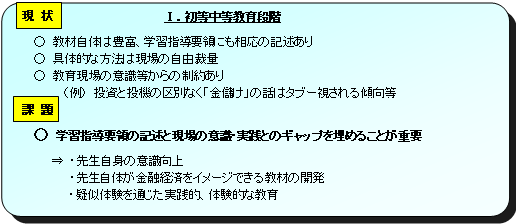 そこで改めて認識された初等中等教育段階の現状は、教材自体は豊富に提供され、学習指導要領にも相応の記述はあり、また教育方法についても、学習指導要領の基本を押さえれば具体的な方法には現場の自由裁量がありながら、学習指導要領の記述と現場の実践との間にはギャップがあるというものでした。その要因としては、授業時間等の制約もさることながら、特に投資と投機も区別なく「金儲け」の話をタブー視する傾向、勤労を尊ぶあまり「労働なしのお金は不正」といった意識が強く見られることや、学習指導要領を消化しつつ先生自体が金融経済をイメージできる教材がなお不足していることが挙げられ、これらを変えていくべきことが課題として認識されました。具体的な教育方法については、金融や投資の社会的意義を見据えながら、疑似体験を通じて実践的、体験的な教育を行うことの重要性が指摘されました。
