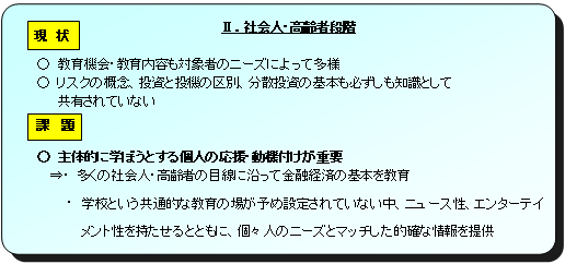 第二は、様々な立場で金融経済教育にこれまで携わってきた各委員の豊富な体験に基づく意見・情報交換を中心に、金融広報中央委員会、文部科学省、金融庁からも情報提供を受けながら、金融経済教育の現状の問題点と今後の課題について、まずは大きく初等中等教育段階と社会人・高齢者段階の2つのライフステージに分けて実情の把握を行い、さらにはその中から、今後官民の協力の下に解決すべき共通の事項を抽出したということです。
