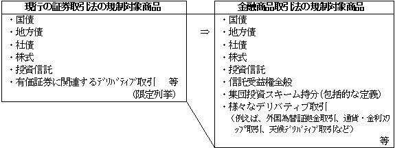 規制対象商品の拡大 近年、金融技術の進展等を背景として、証取法その他の既存の利用者保護法制の対象となっていない金融商品が出現しており、利用者被害が生じている事例もみられます。金商法では、こうした既存の利用者保護法制の「すき間」を埋める観点から、次のように、規制対象商品の拡大を図っています。 |