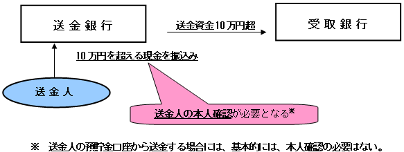 この改正の結果、平成19年1月4日以降、10万円を超える現金送金などを行う際に、金融機関は、送金人の本人確認等を行うことが必要になります。