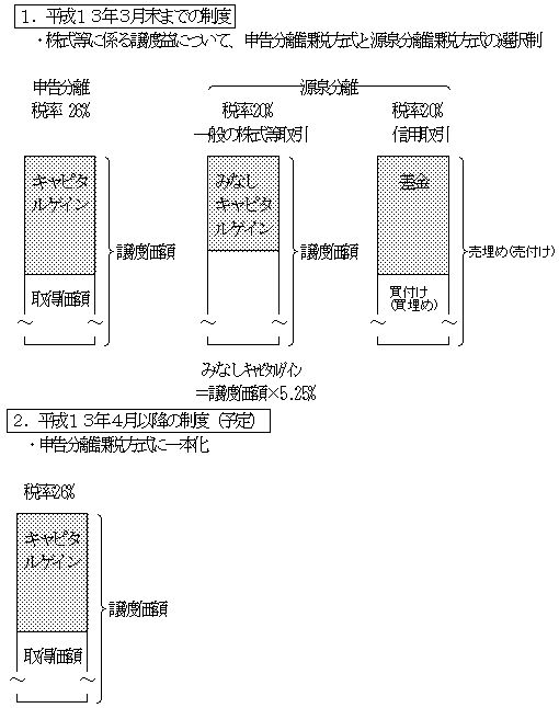株式等の譲渡所得等の課税については、平成11年度税制改正において、平成11年3月末をもって有価証券取引税等を廃止するとともに、上場株式等に係る譲渡所得等の源泉分離選択課税制度については、平成13年3月末までの経過措置とされたところであるが、我が国経済における株式市場の重要性の高まり、各種金融商品に係る課税の中立性の確保、申告分離課税への一本化が株式市場に与える影響等に鑑み、源泉分離選択課税制度を維持する。 更に、源泉分離選択課税制度を維持した上で、株式市場の活性化や課税の中立性確保のため、どのような制度の改善がありうるかについては、欧米諸国における関連税制も参考としつつ、株式取引の実態を踏まえ、検討する。 |