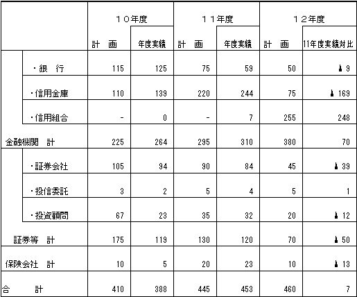 .検査基本計画のポイント 平成12検査事務年度の主な業態に対する検査実施予定数を定めた検査基本計画、及び10、11検査事務年度における検査基本計画と実績の対比は、別表のとおり。 本事務年度の検査実施予定数を昨事務年度の実績と比較すると、信用組合集中検査に重点的に検査要員を投入するため、信用組合の検査実施予定数が大幅に増加している一方、その結果、他業態は概ね減少しており、合計では若干の増加となっている。 なお、検査実施計画は、当初計画として設定しているものであり、金融機関等を取り巻く現下の厳しい経営環境下において適時の実態把握に的確に対応するため、弾力的な運用を行うこととしていることから、実施予定数は変動することがあり得る。 【別表】検査計画と実績の対比 |