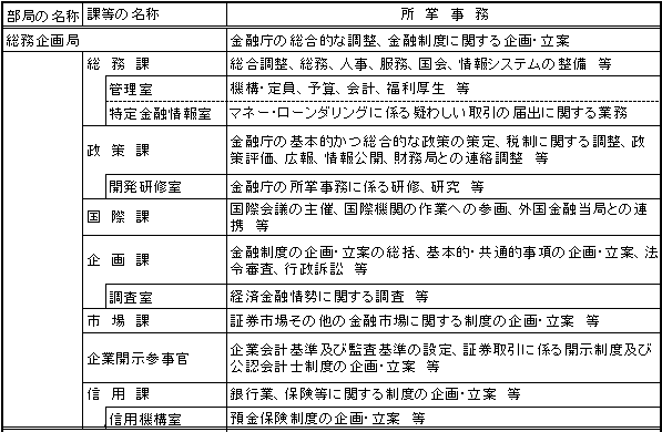 金融庁は、昨年7月1日に、全体の中央省庁再編に先行して、金融再生委員会に置かれていた金融監督庁と大蔵省金融企画局を統合して設立されましたが、本年1月6日の中央省庁再編に当たって、改めて内閣府の外局として設置されるとともに、金融再生委員会の廃止に伴い、同委員会が担っていた破綻処理等の事務を承継することとなりました。これにより、金融庁は、金融制度の企画立案から検査、監督、監視の実施機能までを一貫して担うとともに、銀行、保険及び証券等の分野を横断的に所管し、金融行政を一元的に遂行することになりました。 また、今般の中央省庁再編に伴い、機構面では、内閣機能強化の観点から内閣府に新設された特命担当大臣が金融庁の所管事項について設置されるとともに、金融行政の重要性に鑑み、これまでの総務企画部、検査部及び監督部の3部体制が、総務企画局、検査局及び監督局の3局体制に強化されることになりました。 なお、金融再生委員会が担ってきた破綻処理や資本増強に係る事務に関しては、監督局総務課に金融危機対応室及び監督企画官を新設し、業務執行体制を整備しました。 さらに、資本増強・破綻処理に係る基本的問題及び個別案件のうち特に重要なものに関しては、従来金融再生委員として多大な貢献をされてきた方々の御意見を伺い、その意見を金融行政に適切に反映させるため金融庁顧問会議を設置しています。 | |||||||||