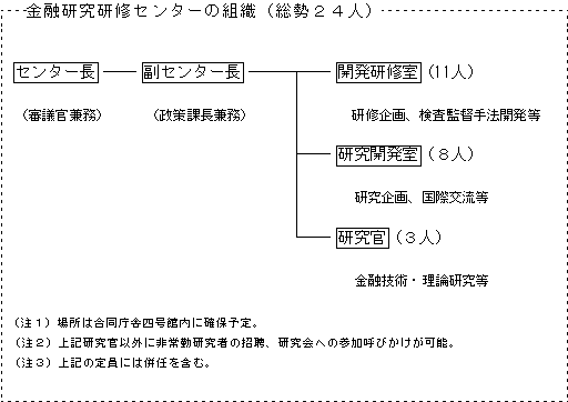 金融庁では、平成13年度に研究研修体制の充実・強化のため「研究開発室」及び「研究官」の新設、「開発研修室」の機能強化が認められたことを踏まえ、「研究と研修を効果的に連携させる」仕組みとして、平成13年7月を目途に「金融研究研修センター」を発足させ、研究研修業務の統合運営を開始。 |