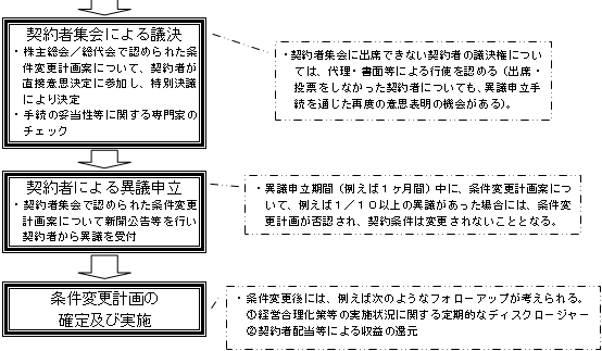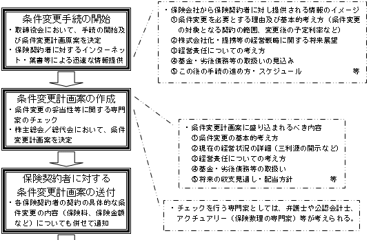 .保険契約の契約条件の変更 現行法上、保険契約の契約条件の変更は、更生手続等による破綻処理の場合に限られている。将来収支分析の適正化等を通じて、この更生手続の早期発動に努めることが重要であり、それ以外に契約条件の変更を可能とする手続を設ける必要は乏しいとの意見があった。これに対して、保険会社・保険契約者自身の意思決定による変更手続として、 |