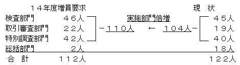 .はじめに 「緊急経済対策」や「今後の経済財政運営及び経済社会の構造改革に関する基本方針」(「骨太の方針」)で、不良債権問題の抜本的解決や証券市場の構造改革等が我が国の国政上の最重要課題となる中、金融庁では、これらの諸課題に迅速に対処するため、平成14年度機構定員・予算要求において、検査・監督・監視体制等の整備を行うこととしている。 |