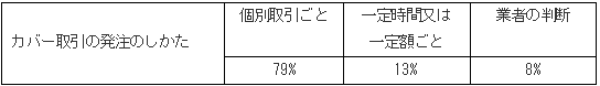 顧客と取引を行った業者が、カバー取引を行う方法としては、個別取引ごとに即座に行うもの、一定時間又は一定額が集まるまでの間業者がポジションを保有し顧客との取引から時間をおいて行うもの、業者の判断に基づいて行うものがあります。