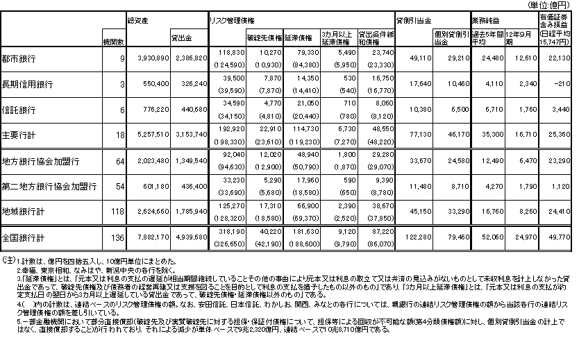 ホーム 報道発表資料 (表1の参考計表)リスク管理債権の状況(平成12年9月期) Tweet 平成13年1月31日 金融庁 (表1の参考計表)リスク管理債権の状況(平成12年9月期) 12年9月期における全国銀行のリスク 管理債権等の状況のポイント 12年9月期における リスク管理債権等の状況 ((表1)(表2)(表3)) (表4) 全国銀行の不良債権 処分損の状況 (表2の参考計表) 金融再生法に基づく資産 査定等報告書の集計結果 (平成12年9月期) (参考) 自己査定の状況 (平成12年9月期) サイトマップ 金融庁についてページ一覧を開きます 組織 大臣・副大臣・政務官 金融庁の概要 金融庁の改革 所管の法人 予算・決算 政策評価 採用情報 報道・広報ページ一覧を開きます 報道対応 報道発表資料 記者会見 大臣談話等 広報活動 アクセスFSA(広報誌) 白書・年次報告 職員による講演等 職員による寄稿等 利用者の方へ 注意喚起情報 業界団体との意見交換会において金融庁が提起した主な論点 よく閲覧されているページ 政策・審議会ページ一覧を開きます 基本方針等 金融行政方針 政府方針における金融庁関連の施策 政策テーマ・施策 政策テーマ等一覧(金融行政方針との関連) 政策テーマ等一覧(全体) 審議会・研究会等 審議会・研究会等一覧 研究・調査 金融研究センター 法令・指針等ページ一覧を開きます 所管法令等 検査・監督の基本方針等 基本方針・ディスカッションペーパー一覧 監督指針・事務ガイドライン 監督指針一覧 事務ガイドライン(第三分冊:金融会社関係)一覧 告示・ガイドライン・Q&A等 告示・ガイドライン・Q&A・法令解釈事例集一覧 金融上の行政処分等 金融機関情報ページ一覧を開きます 全金融機関共通 預金取扱金融機関(銀行等)関連 保険会社関連 金融商品取引業者等関連 金融会社関連 国際関係情報ページ一覧を開きます 国際関係の取組み 国際金融センター 金融庁グローバル金融連携センター(GLOPAC) 監査監督機関国際フォーラム(IFIAR)事務局への活動支援 国際基準設定主体等の公表資料等 金融安定理事会(FSB) バーゼル銀行監督委員会(BCBS) 保険監督者国際機構(IAIS) 証券監督者国際機構(IOSCO) 金融活動作業部会(FATF) その他 アクセスFSA(広報誌) ページの先頭に戻る