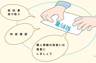 契約書に署名・捺印する前に、金利などの契約内容をよく読んで、不明な内容がある場合にはしっかりと説明を求め、納得できない場合やおかしいと感じた時には、断りましょう。 |