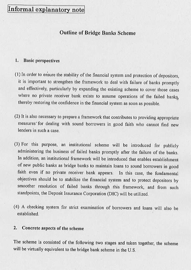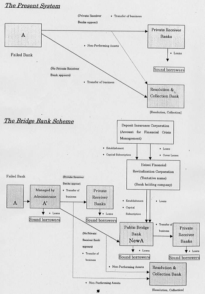 The scheme is consisted of the following two stages and taken together, the scheme will be virtually equivalent to the bridge bank scheme in the U.S.