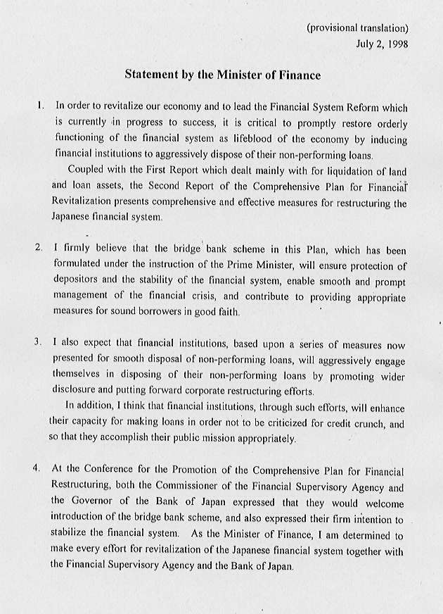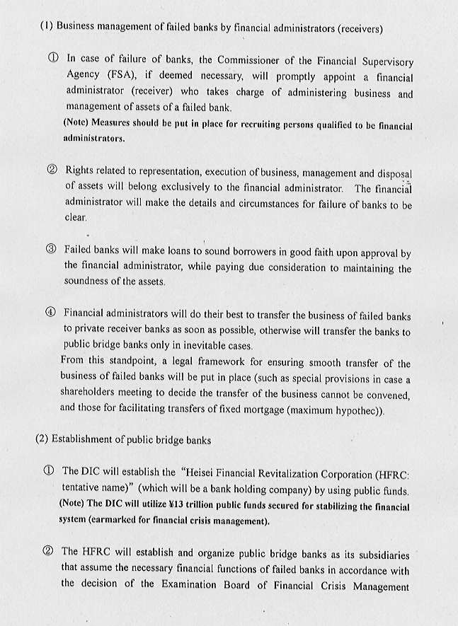 2. On the basis of the basic perspectives as mentioned above, the Agency believes that the following steps, including disposal of bad loans, should be taken for the financial revitalization. Public disclosure based on standards comparable to those set by the Securities and Exchange Commission (SEC) in the United States, and enforcement of market disciplines among financial institutions by the supervision of the Agency, together with various measures set out in the Comprehensive Plan to Enhance the Liquidity of Real Estate and Bank Loan Assets published on April 23, 1998, will facilitate the removal of bad loans from the balance sheet. In parallel with this, the reorganization of financial institutions is expected to advance through market mechanism. The Agency will make its utmost effort to stabilize the financial system utilizing, if necessary, the framework of public funds backed by the Two Acts for Financial Stabilization, and to minimize social and economic cost incurred by the failure of financial institutions through the utilization of the Bridge Bank system to be introduced.