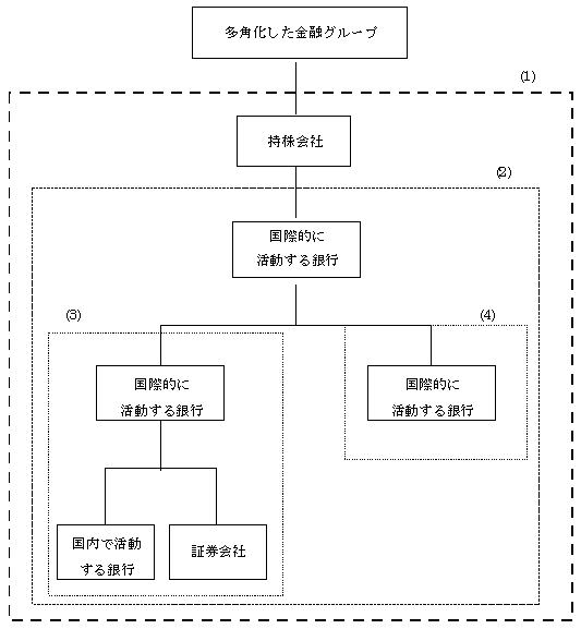 自己資本合意は銀行のリスクを念頭に置いているが、コングロマリット全体の自己資本充実度の評価を改善するには銀行・証券・保険監督当局の自己資本規制を整合的にする努力の継続が必要なことを、様々な業務を営む多角化した金融グループの展開が示している点を当委員会は認識している。多角化した金融グループのレベルでは、監督当局は金融コングロマリットに関するジョイント・フォーラムにより開発された原則と手法を適用することが推奨される。