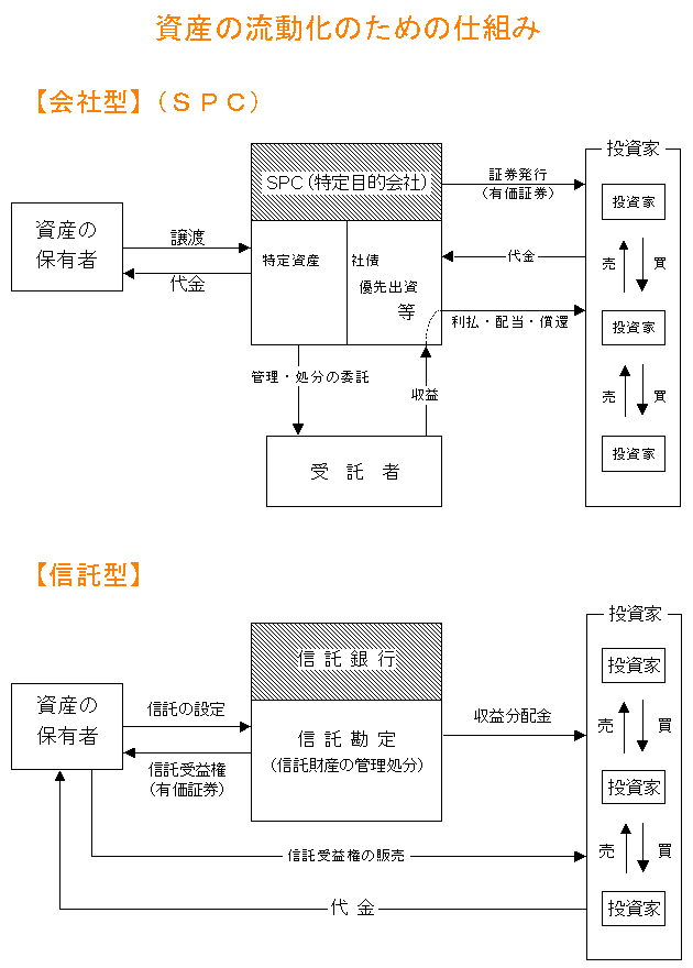 | 2 | .信託型の創設 信託を用いた資産流動化について、会社型と同様の仕組みを整備する。 ○受益権を有価証券にする、○権利者集会制度を創設し多数決による意思決定を可能とする、○情報開示制度を充実する等の措置を講ずる。 |