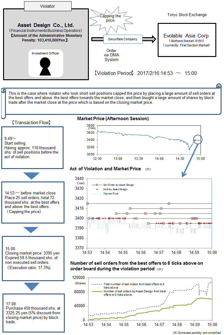 Asset Design is a stock company that is registered with the Commissioner of the Kanto Local Finance Bureau as an Investment Management Business and a Type II Financial Instruments Business Operator, and has the discretionary investment management right for the assets of Asset Design COPROS Fund (“COPROS Fund”), a unit trust registered in the Cayman Islands, pursuant to the investment management agreement entered into with Elian Trustee (Cayman) Limited as the trustee of COPROS Fund. Asset Design, through an employee who engaged in securities trading as an investment officer, in relation to its business, regarding shares of Evolable Asia Corp., whose shares were listed on the Tokyo Stock Exchange Mothers Market, from 2:53 pm to 3:00 pm on February 16, 2017 as described in the Appendix, with the purpose of inducing sales and purchase of other market participants, conducted transactions by placing a large amount of sell orders at prices equal to the best offer and above the best offer price on the Tokyo Stock Exchange. Thus, in total, Asset Design sold 12,500 shares while placing orders for the sales of 59,500 shares. Of those transactions, approximately 4.24%, which is equivalent to the contribution ratio to COPROS Fund of Asset Design and Persons who have special relationship with Asset Design, of which are on its own account and the rest of which are on the accounts of other investors of COPROS Fund. These constituted a series of sales and purchase of securities and entrustments that would mislead others into believing that sales and purchase of the shares were thriving and would cause fluctuations in prices of the shares.