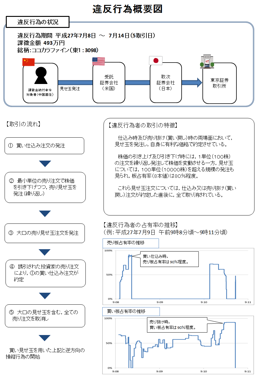 課徴金納付命令対象者(中華人民共和国に居住)は、東京証券取引所市場第一部に上場されている株式会社ココカラファインの株式につき、同株式の売買を誘引する目的をもって、別表記載のとおり、平成27年7月8日午前9時6分頃から同月14日午前9時10分頃までの間、合計5取引日において、約定させる意思がないのに、最良買い気配値と同値又はその下値に多数の買い注文を発注するなどの方法により、同株式合計79万700株の買付けの委託を行うとともに、同株式合計11万6200株を売り付ける一方、最良売り気配値と同値又はその上値に多数の売り注文を発注するなどの方法により、同株式合計105万4100株の売付けの委託を行うとともに、同株式合計11万6400株を買い付けるなどし、もって、自己の計算において、同株式の売買が繁盛であると誤解させ、かつ、東京証券取引所市場第一部における同株式の相場を変動させるべき一連の売買及び委託をしたものである。