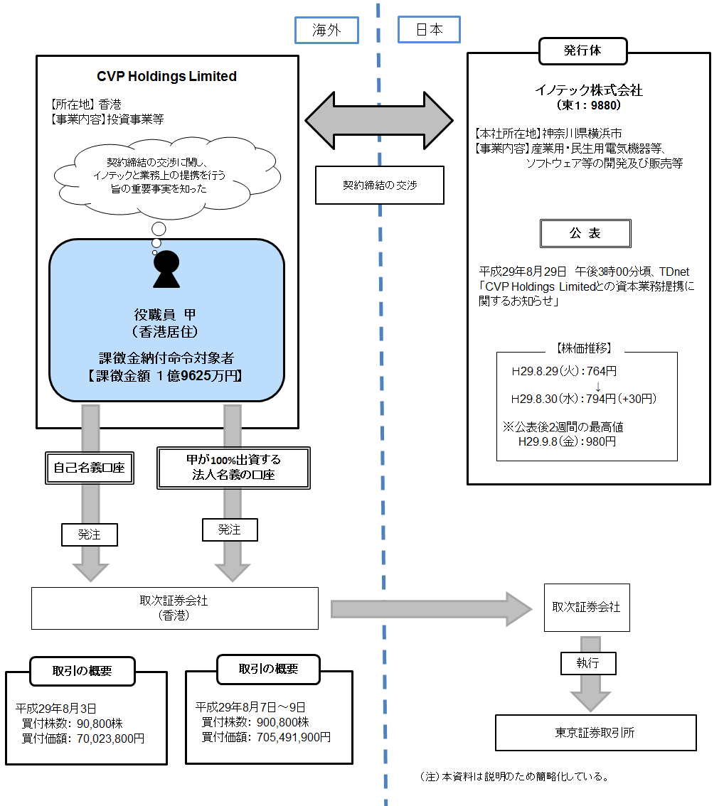 課徴金納付命令対象者(香港に居住)は、香港に所在し、投資事業等を目的とするCVP Holdings Limited(以下「CVP」という。)の役職員であるが、イノテックとCVPの株式の取得を伴う業務上の提携の交渉に関し、イノテックの業務執行を決定する機関がCVPと業務上の提携を行うことについての決定をした旨の重要事実を知りながら、当該重要事実の公表がされた平成29年8月29日午後3時より前の同月3日から同月9日までの間、自己及び同族会社の計算において、イノテック株式合計99万1600株を買付価額合計7億7551万5700円で買い付けたものである。